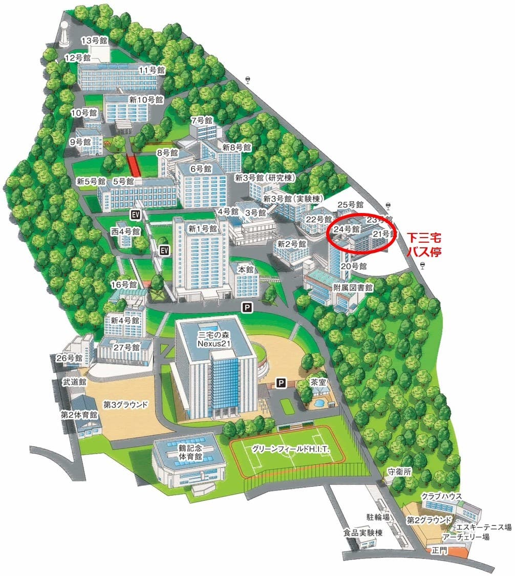 地球環境学科の学科事務室、教員研究室等は21号館・24号館内にあります。本学正門から入られる場合、附属図書館横の通路を右折してください。最寄りのバス停は広電バス・下三宅バス停です。五日市駅南口発東観音台行きのバスが停車します。